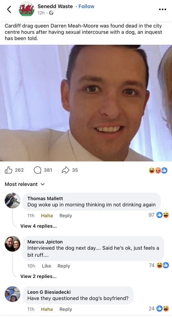 DdraigGoch · 06-02-2026 1108I heard he was hung over. But he didn't understand what hair of the dog means Did the dog say if it was a giver or a taker.?? ….it was Cardiff? You need to define dog a bit better Have they questioned the dog’s boyfriend? I have had a few dogs, but they cooked me a breakfast He took the phrase give a dog a bone to the extreme 🤣 How did they know? Did the dog make a report? Imagine if Crimewatch had to do a re enactment of this mess! 😬😭 Which diversity box does this tick then? Apparently it’s not the first time this has happened!…….He was before the courts for a similar offence prior. The judge said “This is a disgusting act, how low can you get”? Meah-Moore replied:“Dachshunds, your honour”! Ahh, the old ones are the best! 😂 Old drag boy darren went to the lane to give old rover a bone! When he bent over up jumped rover and gave him a bone of his own!!🤣 The dog wishes to remain anonymous Did he sniff the dogs arse first🤣